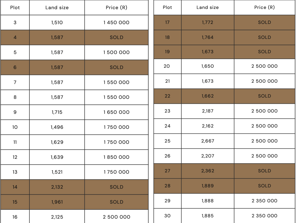 The price list document outlines the cost of each erf. It provides details on pricing and availability. It helps customers make informed purchasing decisions.